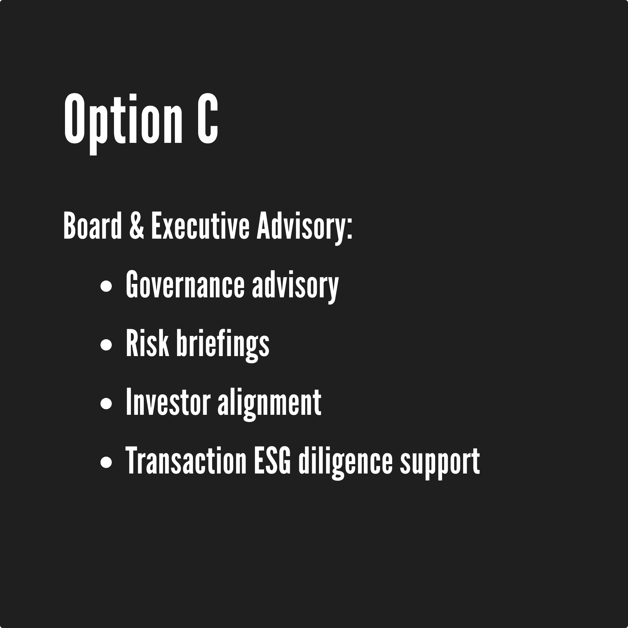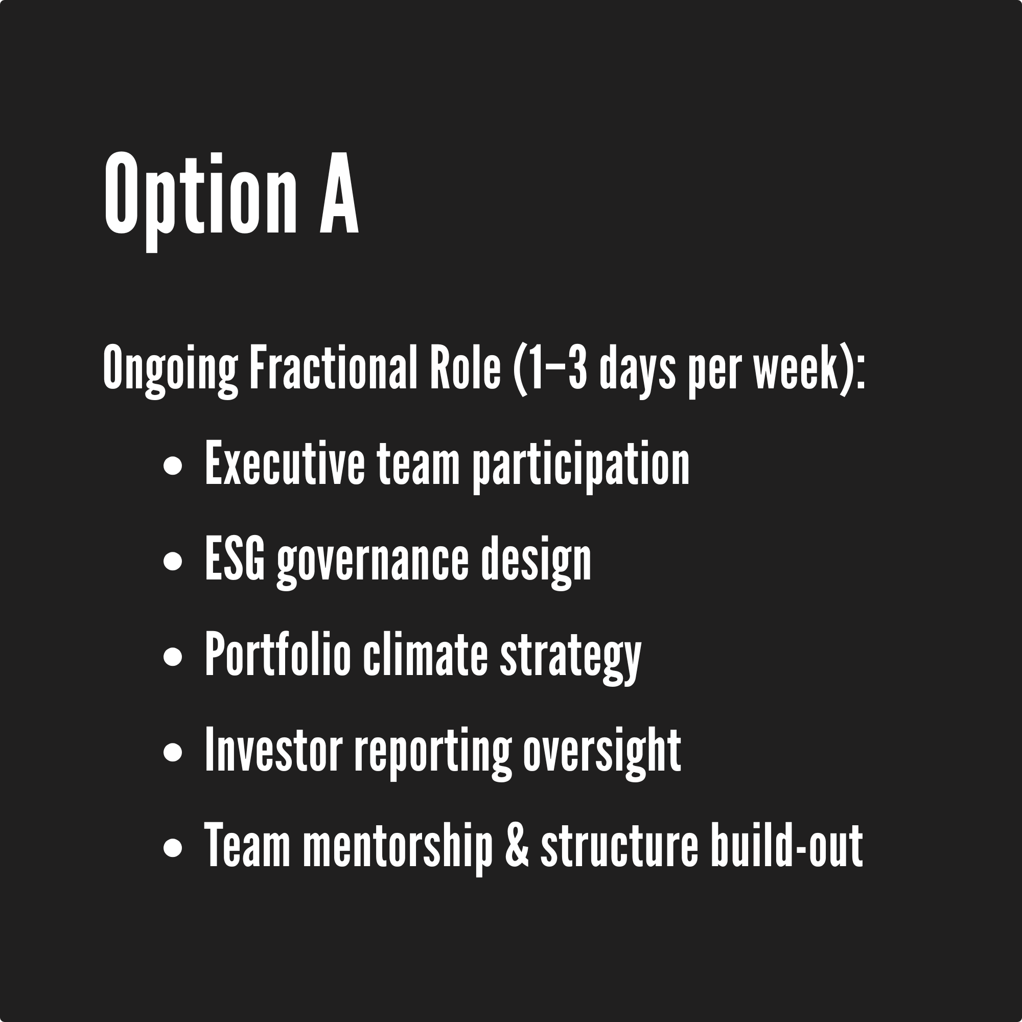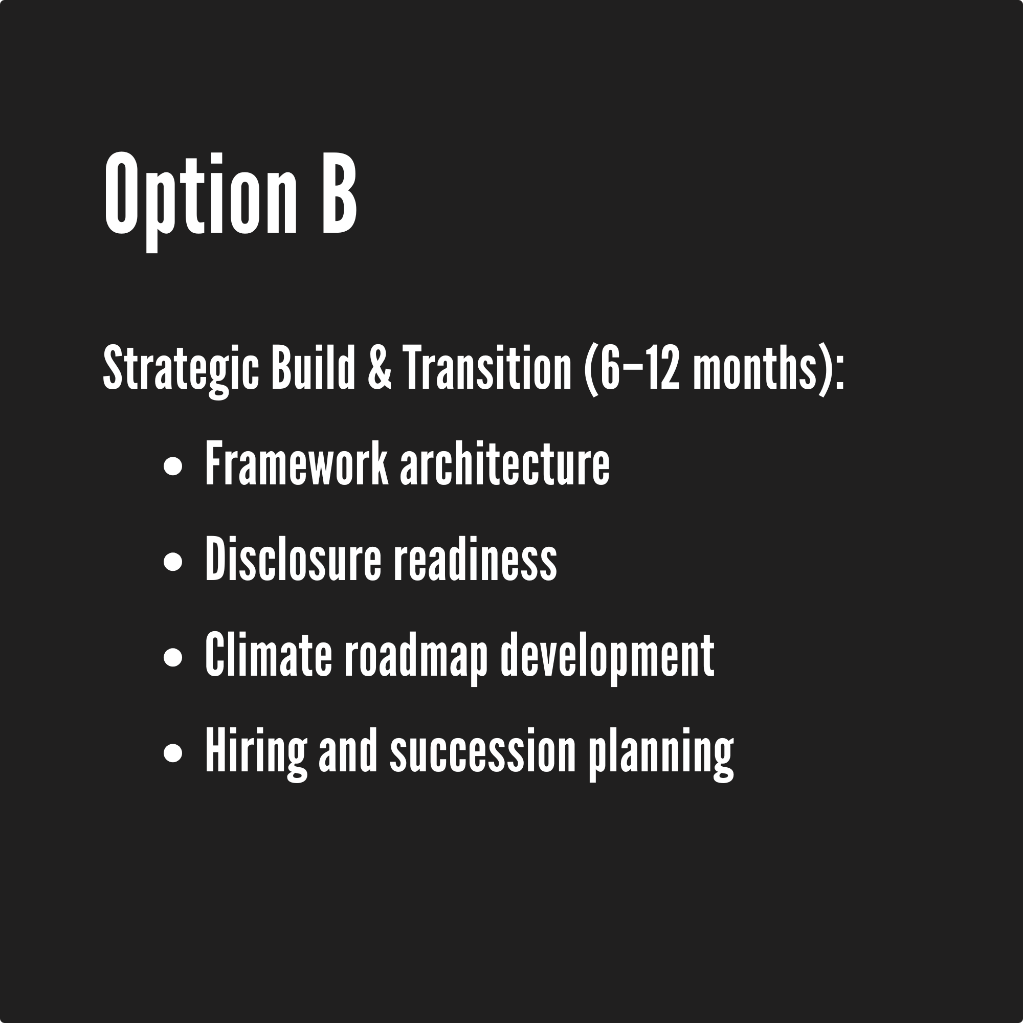 The following engagement models outline how I serve as a fractional Chief Sustainability Officer embedded within the executive team.