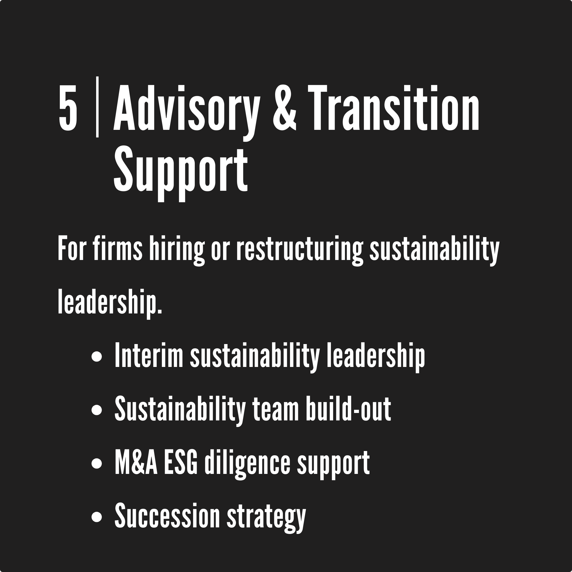 Sustainability is, in many organizations, a full time executive function. Yet organizations operate at different stages of ESG maturity. A fractional Chief Sustainability Officer model provides experienced leadership aligned with current needs, while establishing a clear pathway to permanent executive leadership as the platform evolves. If I am fully committed at that stage, I lead the recruitment and transition process to ensure continuity.